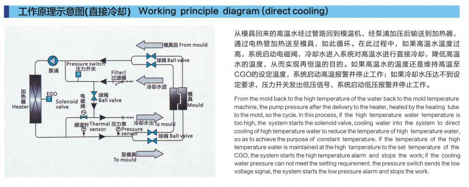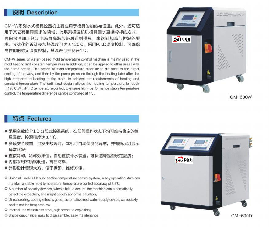 CM-W系列水式模具控溫機主要應用于模具的加熱與恒溫。此外,還可適用于其它有相同需求的領(lǐng)域。此系列模溫機以模具回水直接冷卻的方式,再由泵浦加壓經(jīng)過電熱管高溫加熱后送到模具,來達到加熱與恒溫的要求。其優(yōu)化的設(shè)計使加熱溫度可達±120℃。采用P.I.D溫度控制,可確保高性能的穩(wěn)定溫度控制,其溫差可控制在1℃。