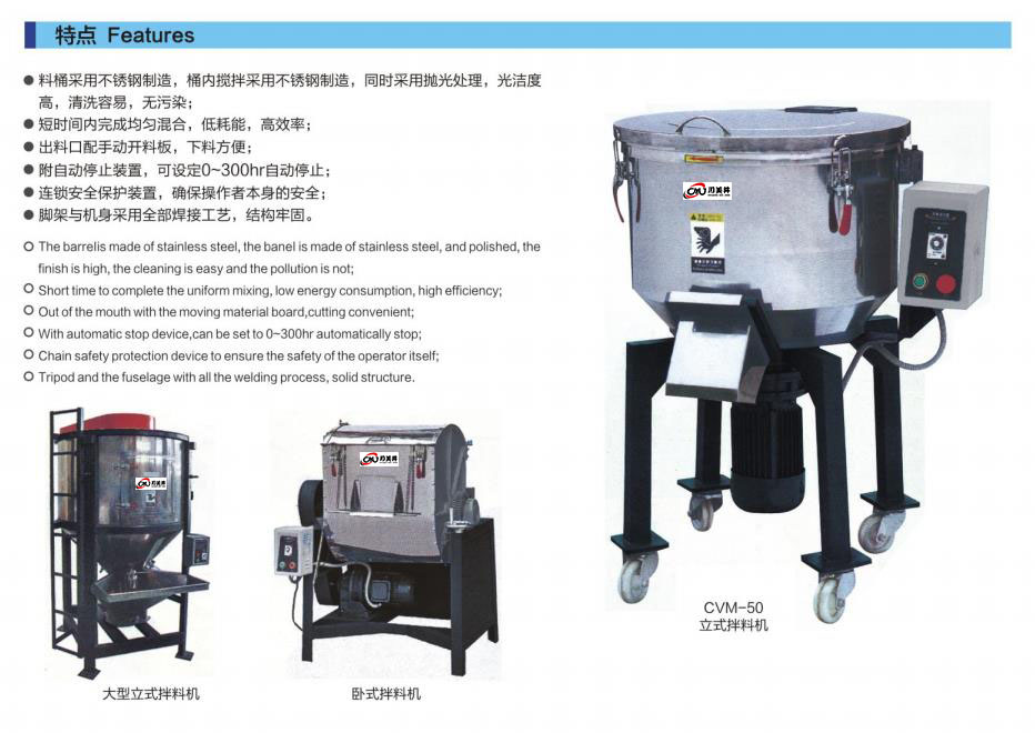 料桶采用不銹鋼制造,桶內(nèi)攪拌采用不銹鋼制造,同時(shí)采用拋光處理,光潔度高,清洗容易,無污染; 短時(shí)間內(nèi)完成均勻混合,低耗能,高效率;出料口配手動(dòng)開料板,下料方便;