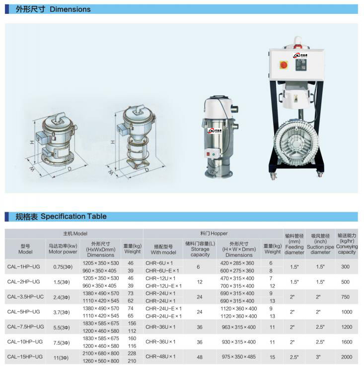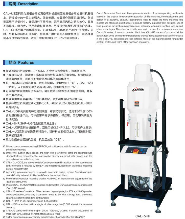 CAL-US系列歐化三相分離式真空填料機是在原有三相分離式填料機基礎(chǔ)上,開發(fā)設(shè)計的一款功能強大、外表美觀、安裝操作簡便的填料機。各機型采用不銹鋼料斗,確保原料不受污染;采用高壓風(fēng)機為動力核心,具有不易損壞,吸力大,使用壽命長等優(yōu)點。另提供經(jīng)濟型機種供客戶選擇。CAL-US系列真空粉體填料機,它具備CAL-US系列產(chǎn)品的一切優(yōu)點,同時,另有雙段風(fēng)機可供選配;根據(jù)其在用戶端的不同使用情形,可選擇裝載不同過速器的料桶,適用于含粉量30%及100%的輸送作業(yè)。