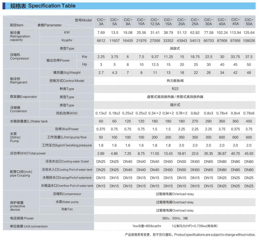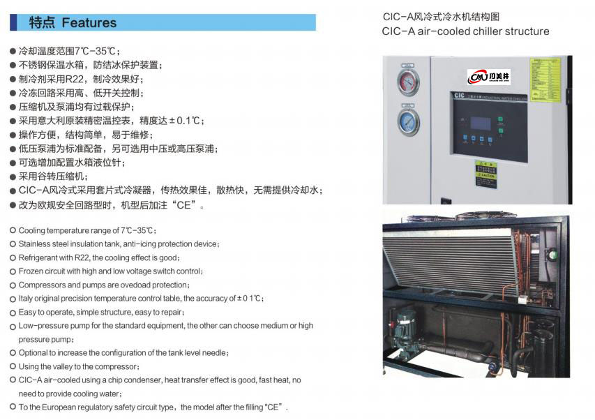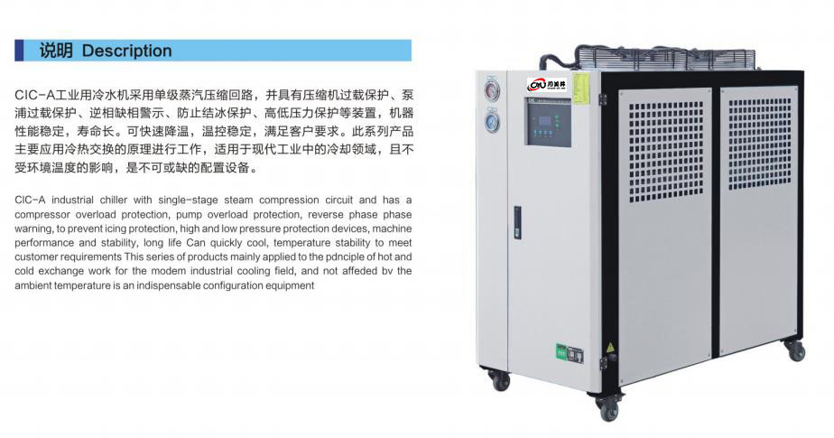 cIC-A工業(yè)用冷水機(jī)采用單級(jí)蒸汽壓縮回路,并具有壓縮機(jī)過載保護(hù)、泵浦過載保護(hù)、逆相缺相警示、防止結(jié)冰保護(hù)、高低壓力保護(hù)等裝置,機(jī)器性能穩(wěn)定,壽命長??煽焖俳禍?,溫控穩(wěn)定,滿足客戶要求。此系列產(chǎn)品主要應(yīng)用冷熱交換的原理進(jìn)行工作,適用于現(xiàn)代工業(yè)中的冷卻領(lǐng)域,且不受環(huán)境溫度的影響,是不可或缺的配置設(shè)備。